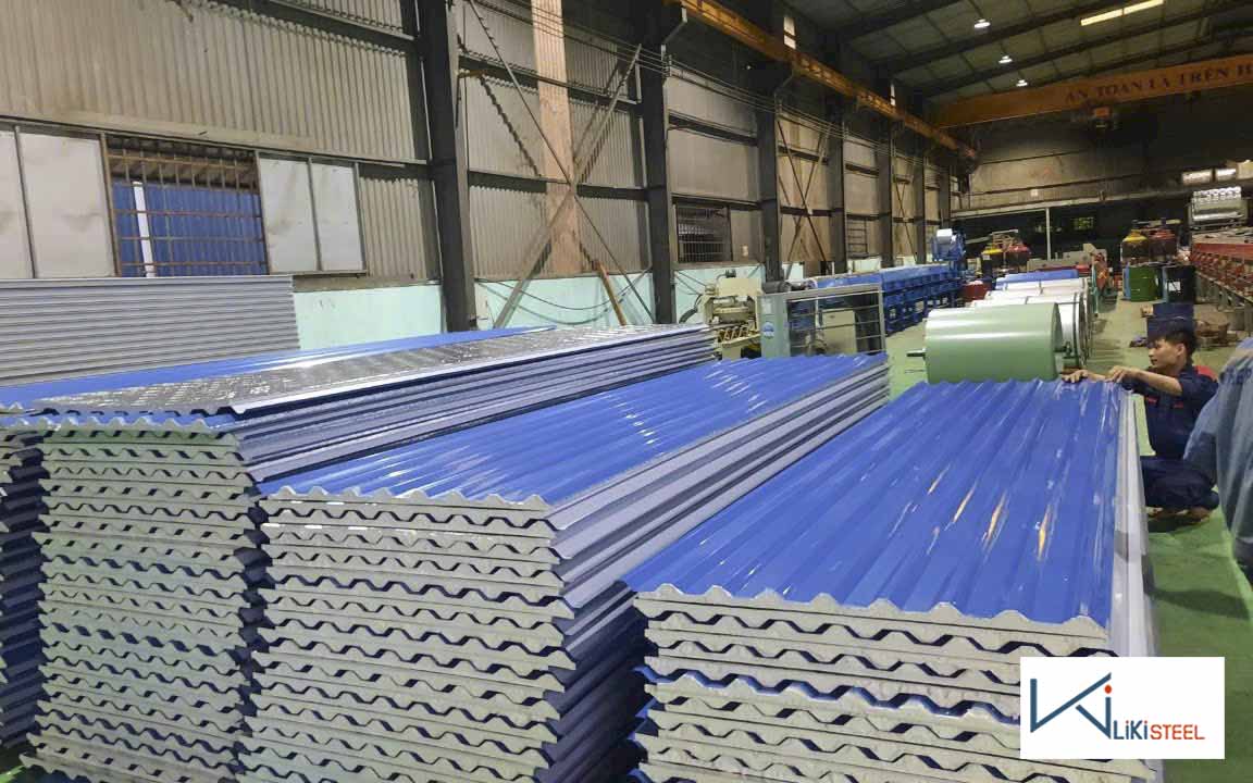- Nhà xưởng và kho bãi: Bảo vệ hàng hóa, máy móc khỏi nhiệt độ cao, phù hợp kho thực phẩm, hóa chất, hoặc thiết bị. Độ dày 0.40-0.50 mm, lõi PU đảm bảo độ bền 10-40 năm, chống ăn mòn tốt.